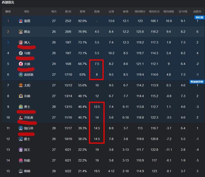仅今天这一天,西部迎来大洗牌,掘金赢球后稳住了自己第二的位置,湖人战胜爵士不仅仅让自己排名重回西部第三,并且间接帮了勇士一个大忙,倘若不是湖人战胜爵士那么勇士与爵士之间的胜场差就只有1个,2-3场比赛就将被反超,并且开拓者、独行侠全部赢球,如此发展下去勇士不是没有可能跌出附加赛,目前勇士13胜15负排名已经跌到了西部第九,仅仅领先开拓者1.5个胜场,领先独行侠、爵士两个胜场,并且从赛程来看勇士接下来将分别面对太阳、魔术、独行侠、猛龙这四场球勇士至少都有一半输球概率,也许元旦之前勇士就要跌出附加赛了!马刺击败奇才,火箭输给鹈鹕已经落后第四马刺2个胜场了,连续输球后仅仅领先第六森林狼0.5个胜场,下一场比赛还要打掘金,搞不好就要跌出西部前六。开赛以来火箭拥有全联盟最轻松的赛程成绩却一般,想争冠必须要交易补强!