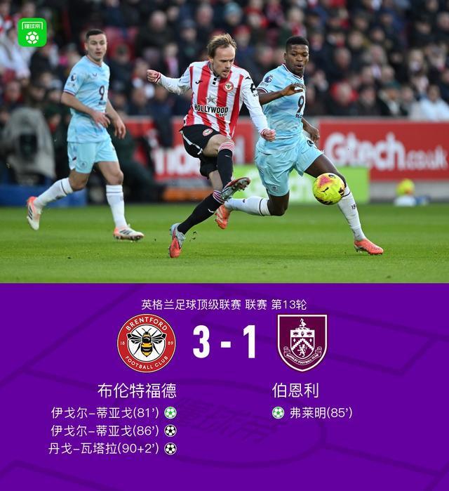 北京时间11月29日,英格兰足球超级联赛第13轮,布伦特福德坐镇主场迎战伯恩利。比赛中,伊戈尔-蒂亚戈率先为布伦特福德罚入点球取得领先。随后,伯恩利由弗莱明同样通过点球破门将比分扳平。仅过片刻,伊戈尔-蒂亚戈再度建功,帮助主队重新掌握优势。比赛进入补时阶段,亨德森送出助攻,丹戈-瓦塔拉冷静推射得手锁定胜局。最终,布伦特福德以3比1战胜伯恩利。