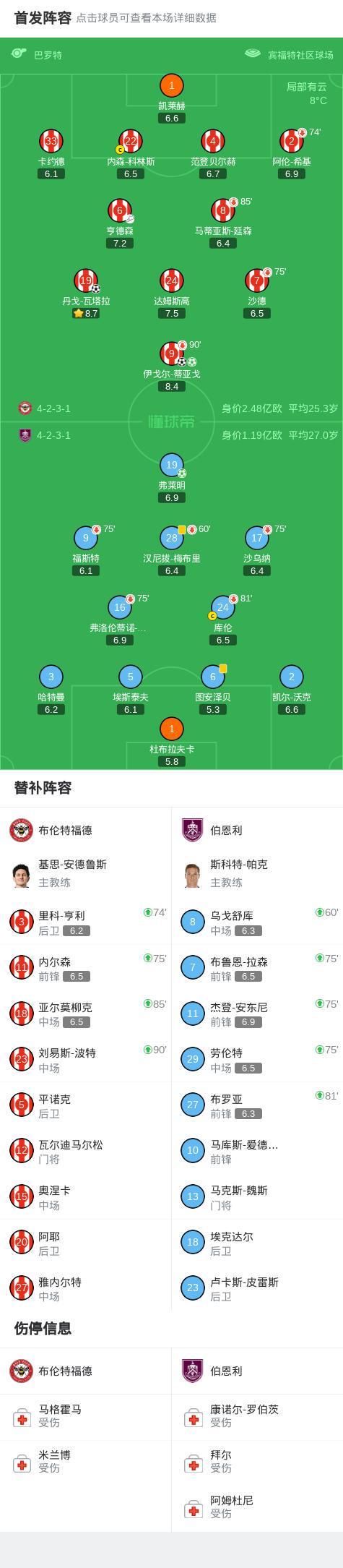 第81分钟,图安泽贝送点,伊戈尔-蒂亚戈操刀命中,布伦特福德1-0!