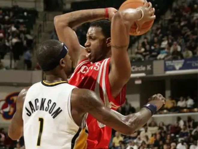 杰克逊的马刺生涯,表现还有点儿起伏起伏不定,我还记得他在马刺时,那个略显奇怪的定点三分姿势。到了步行者,他与汀斯利、阿泰、小奥尼尔,在老米勒带领下,共同帮助步行者重新成为联盟豪强,可惜奥本山宫殿事件,毁了这支队。