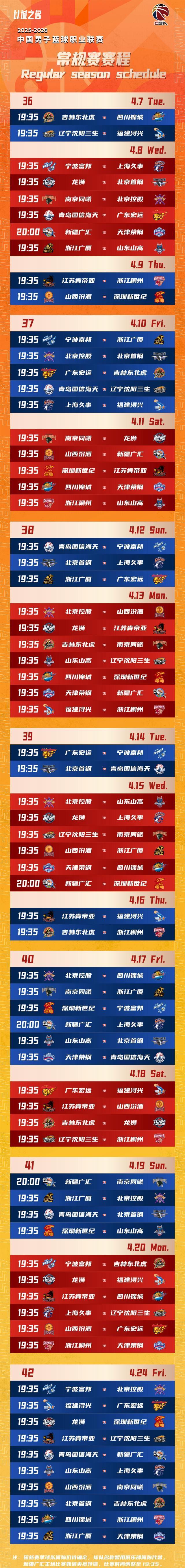 CBA新赛季赛程出炉:12月12日开打,揭幕战广厦对阵山西,常规赛共42轮