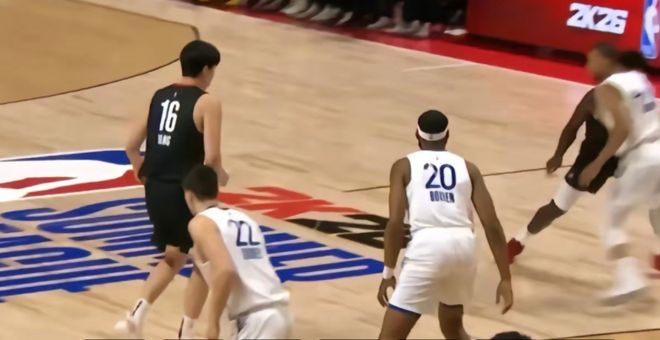 杨瀚森本场主要对位灰熊主力中锋埃迪,后者的力量、体能、比赛经验均在杨瀚森之上,属于NBA首发级别球员。