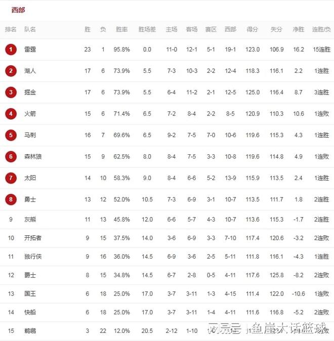同时在今天的比赛中也是有一队给快船送温暖,这支球队就是国王,快船在近期表现糟糕是频频遭遇逆转,这也让快船掉到了西部第十四的位置,可现在随着国王输掉比赛,两队之间也总算是没有了胜场差,所以接下来快船也有望去提升自己的排名。至于勇士这里则是被太阳甩开了差距,本来这段时间勇士表现出色是慢慢追上了太阳,可如今随着太阳爆冷赢球,太阳的领先优势再次扩大,如今排在西部第八的勇士也是落后太阳1.5个胜场。