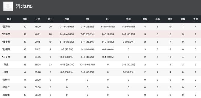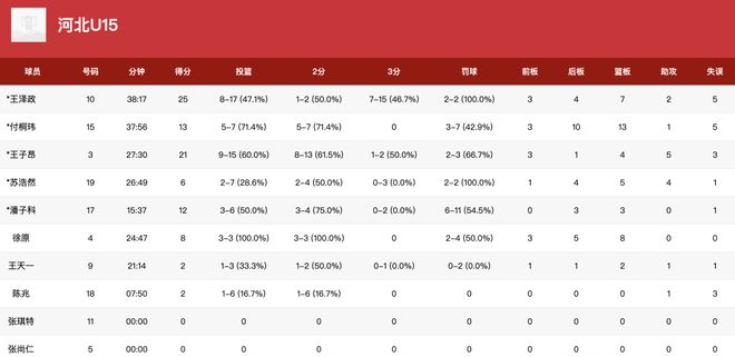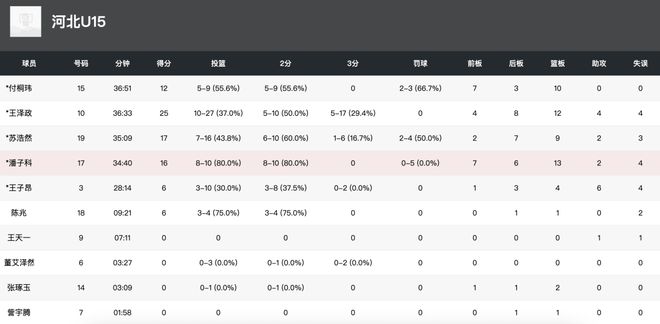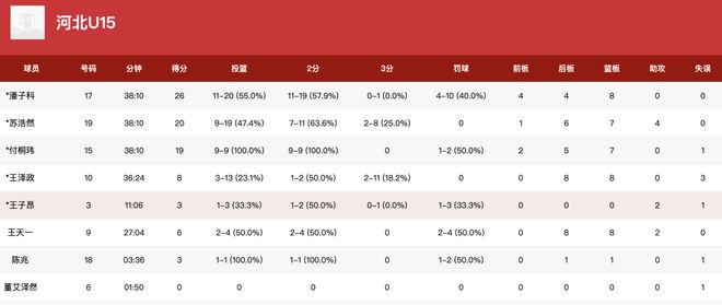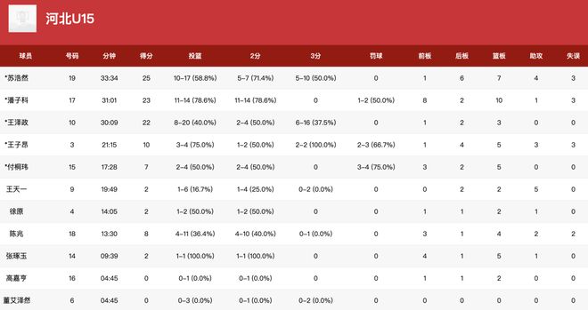 在预赛阶段,小将付桐玮场均贡献11.8分10篮板的两双数据,而另一名小将苏浩然场均可以贡献17.7分6.8篮板3.3助攻2.8抢断的全面数据。