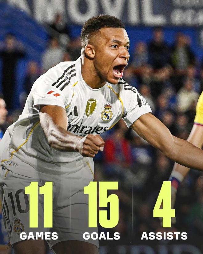 14-15赛季C罗后,姆巴佩成前9轮进球10+的皇马首人