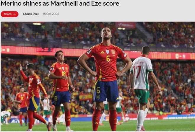 西班牙在世预赛中4-0击败保加利亚,此役梅里诺首发踢满全场,并头球完成梅开二度!这样的话,梅里诺在4场世预赛中已经打进6球!祖比门迪本场比赛同样首发登场,出战了62分钟。拉亚作为替补没有出场。