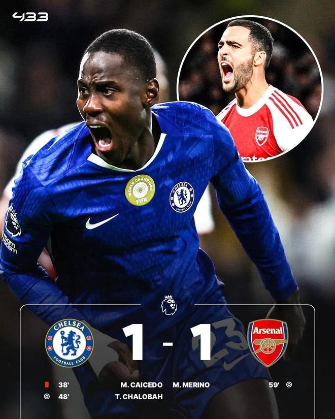 2025年12月01日 十人切尔西1-1阿森纳 凯塞多直红查洛巴梅里诺破门 枪手5分领跑