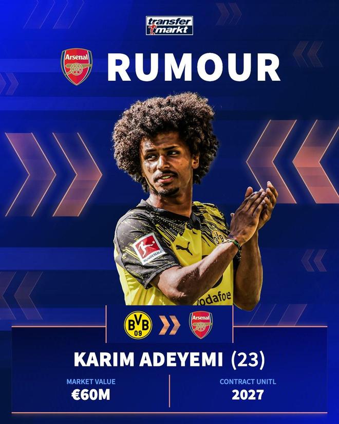 按照德转的说法,在阿德耶米现有合同2027年到期的情况下,多特蒙德可能在明年夏天面临出售球员的压力,在这种情况下,阿森纳正在考虑追逐这位现年23岁的德国球星。