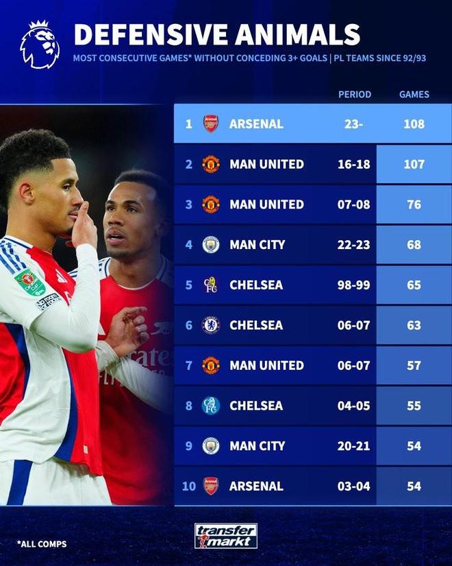 根据统计,阿森纳已经在连续108场比赛中单场比赛中丢球不超过3球,创造了英超球队在所有赛事中单场比赛失球不超过3个的纪录。