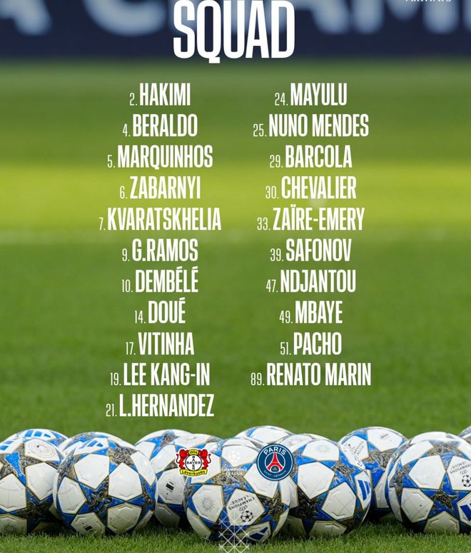 2-阿什拉夫、4-贝拉尔多、5-马尔基尼奥斯、6-扎巴尔尼、9-拉莫斯、10-登贝莱、14-杜埃、17-维蒂尼亚、19-李刚仁、21-卢卡斯、24-马尤鲁、25-门德斯、29-巴尔科拉、33-扎伊尔·埃梅里、39-萨福诺夫、47-恩詹图、49-姆巴耶、51-帕乔、89-雷纳托·马林
