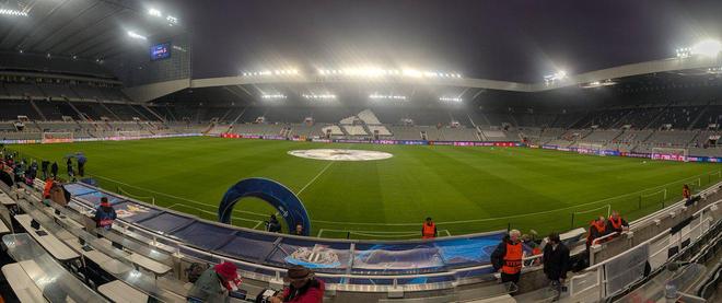 纽卡对阵本菲卡赛前,圣詹姆斯公园球场下起暴雨