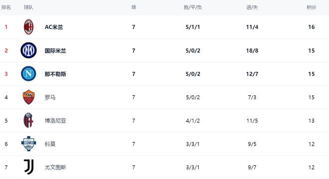 在意甲积分榜,AC米兰的战绩是5胜1平1负,拿到16分,排名榜首。而国际米兰的战绩是5胜2负,15个积分,排名第2。那不勒斯和罗马也都是15个积分,净胜球不如国际米兰,排名第3和第4名。博洛尼亚以13分排名第5。科莫和尤文图斯都是12个积分,排名第6和第7。亚特兰大只拿到11分,排名第8。至于拉齐奥,2胜2平3负,只拿到8分,排名第11。