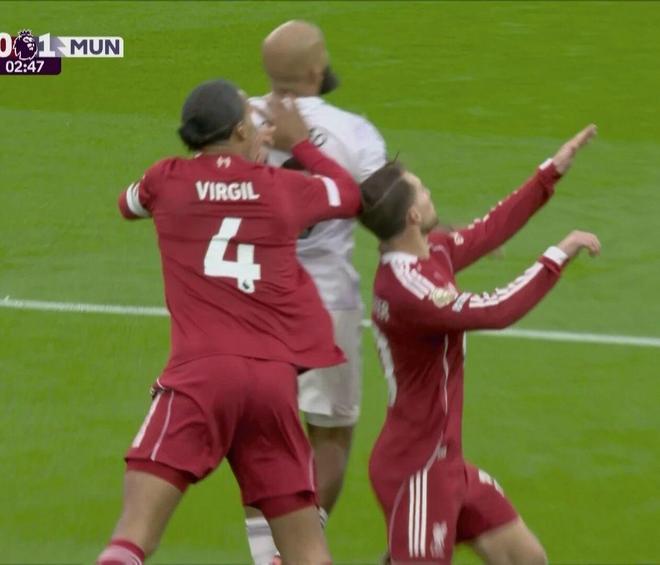 慢镜显示,麦卡利斯特当时后撤与姆贝莫争抢头球,却被队友范迪克意外肘击倒地。