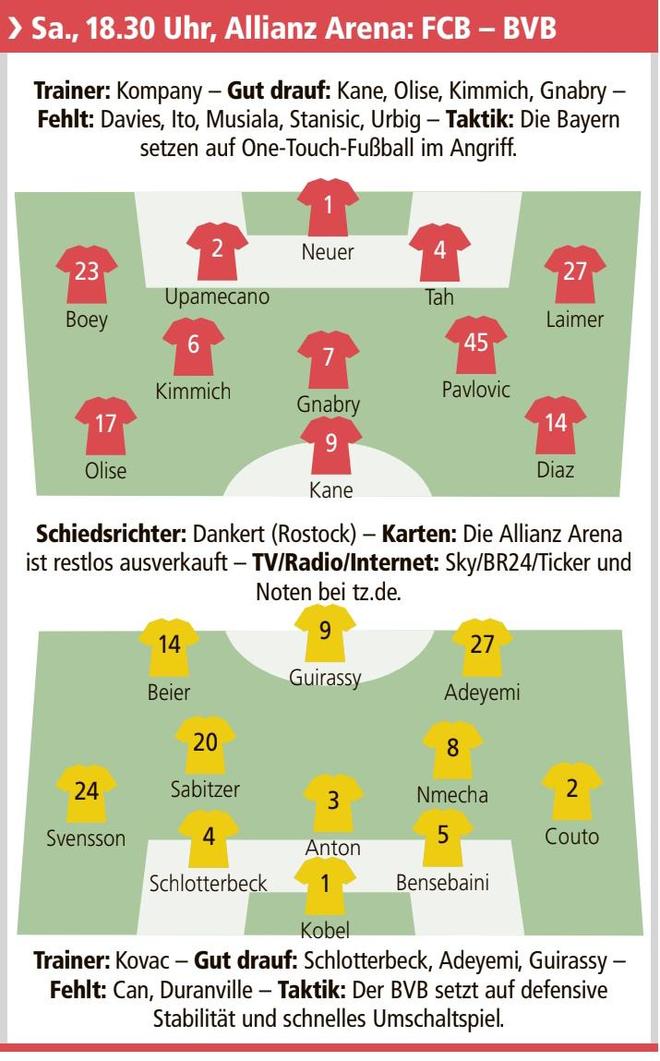 雷速体育10月18日讯 北京时间10月19日00:30,德甲第7轮,拜仁慕尼黑主场对阵多特蒙德,迎来本赛季第一回合德国国家德比,本场比赛开始之前,德国媒体《慕尼黑日报》预测双方首发阵容。拜仁慕尼黑方面由目前脚感火热的凯恩、路易斯·迪亚斯领衔,他们两人目前也高居德甲射手榜前二名,而多特蒙德方面也有锋霸吉拉西助阵。
