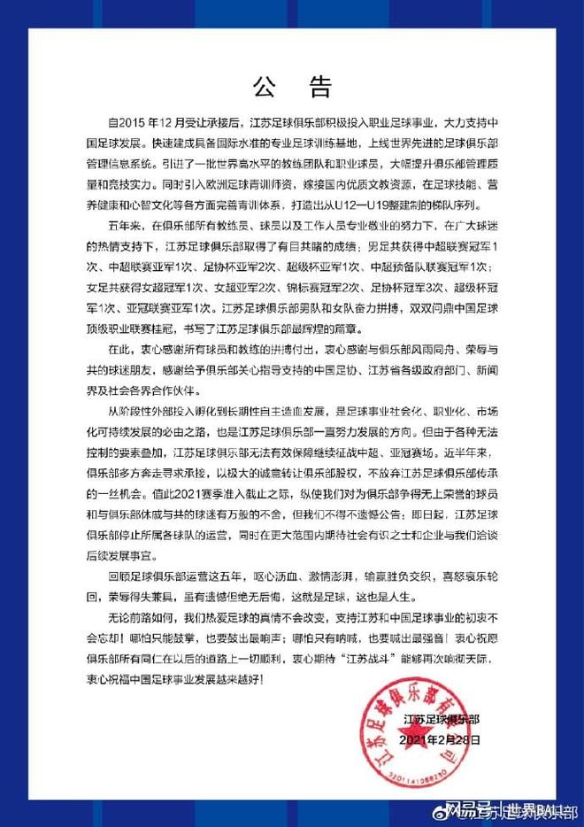 时至今日,江苏队的历史仍停留在2021年3月无法获得中超准入资格、暂别职业联赛舞台的时刻。这个时刻究竟只是一个暂停点,还是队史的终点,姑且拭目以待吧。