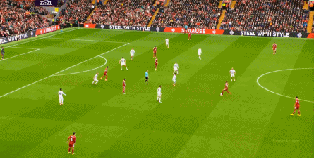 这个进球让曼联获得了比分上的优势,也打出了额外的信心,但利物浦的反扑很快就到了,通过直接的斜长传和传带渗透,利物浦完成两次球权转移,让曼联的右路感受到了威胁: